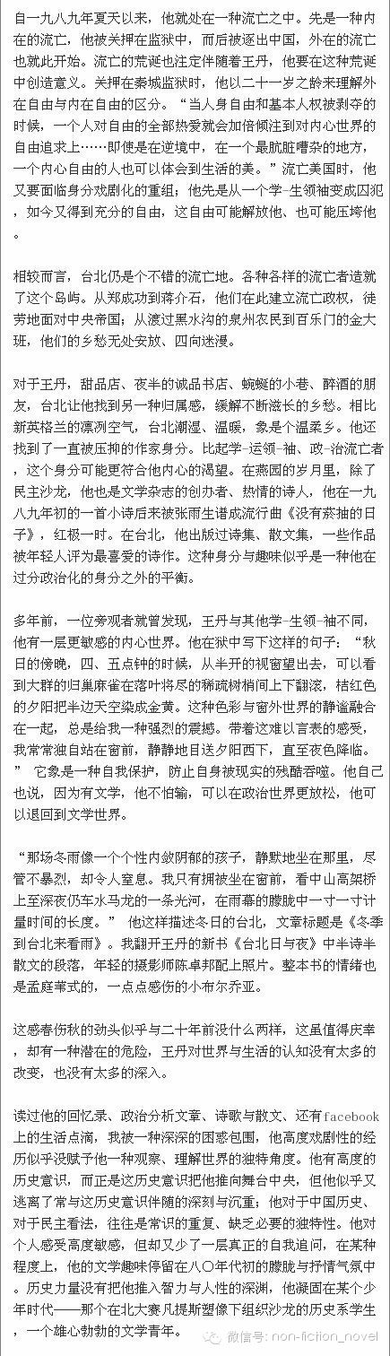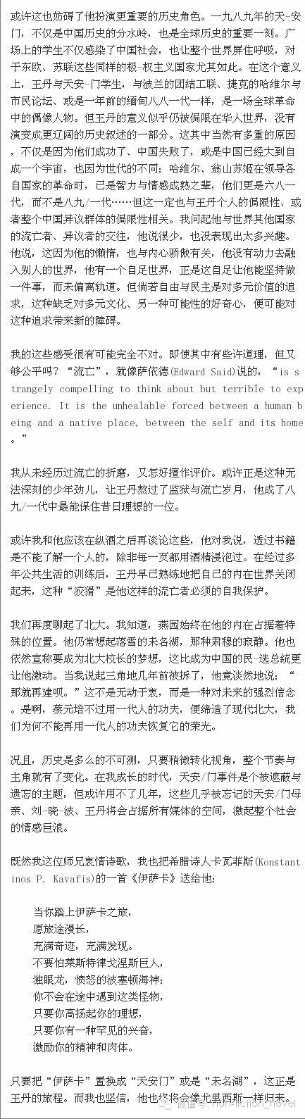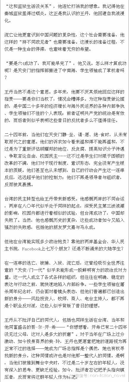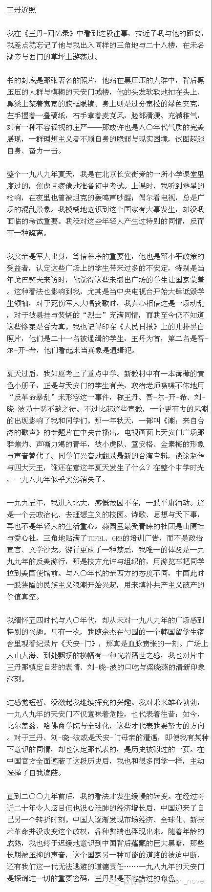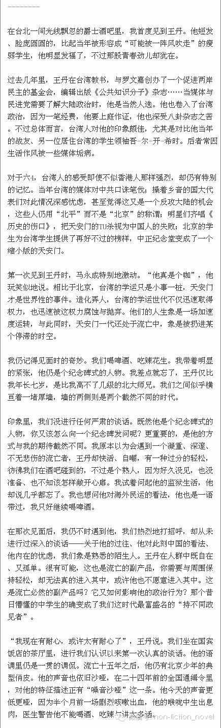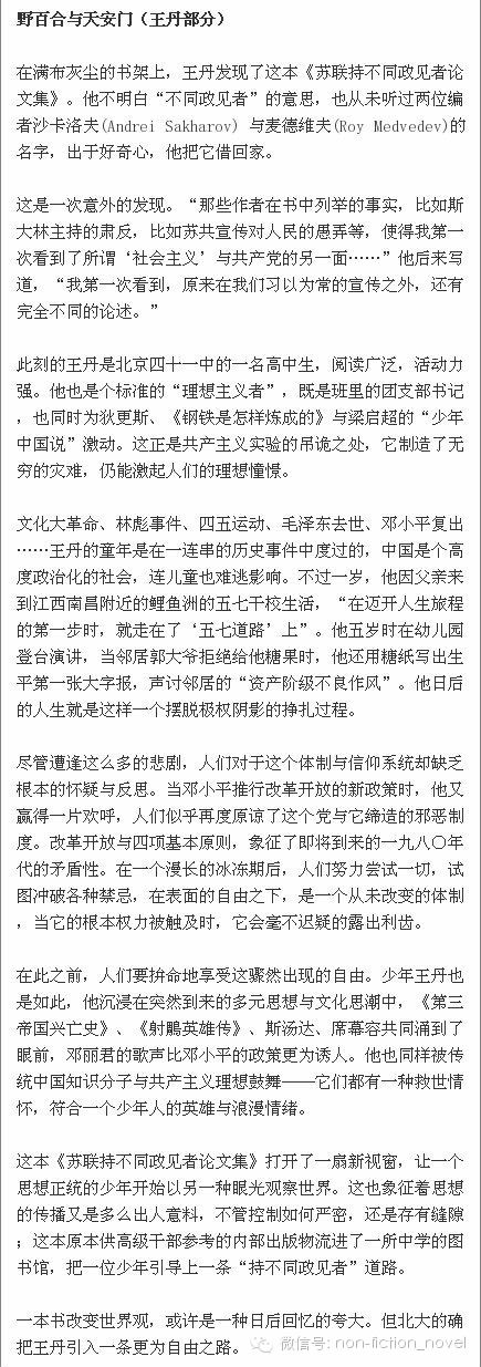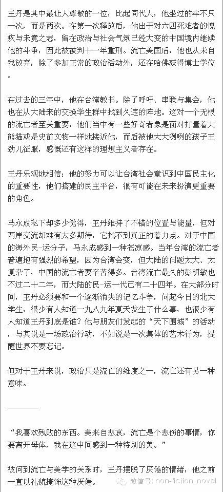 这篇作品出自许知远先生在台湾出版的新书《抗争者》,《野百合与天-安门》原本讲述了罗文嘉、马永成、王丹三个人的故事。因为王丹的部分更为大陆读者所关切,而且具备完整性。