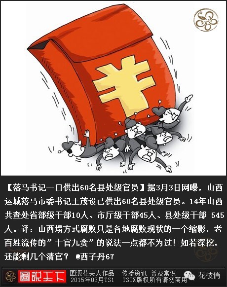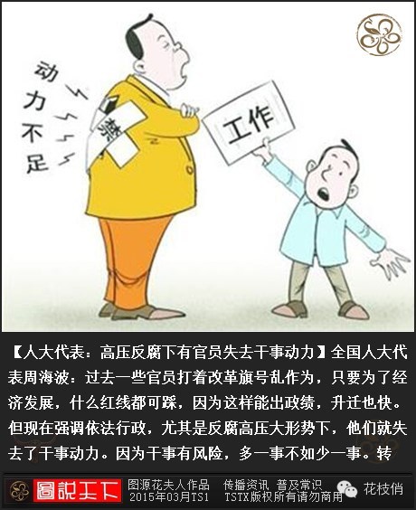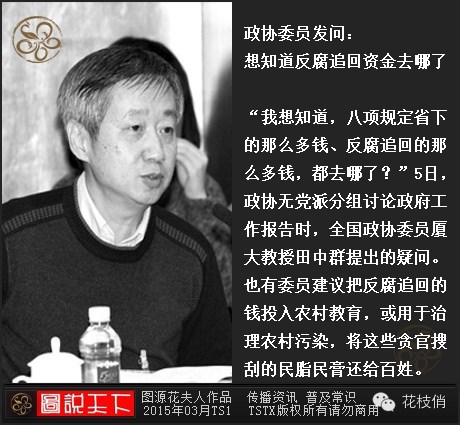 问:“我想知道,八项规定省下的那么多钱、反腐追回的那么多钱,都去哪里了?”答:“反腐和老百姓有很大的关系。政府的行政经费、用在教育上的经费、公共建设方面的经费都是有固定预算的。如果大吃大喝或是贪污到个人腰包,那么用在公共建设上和教育上的钱就少了。”——钱归原项目啦?嘿嘿,证据呢?20150306