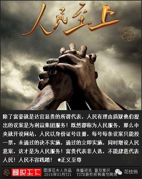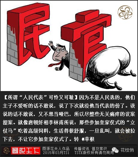 【庆贺两会】上联:戏子、婊子、骗子、聋子、瞎子、傻子、败家子,子子齐聚论发展; 下联:贪官、脏官、腐官、裸官、昏官、庸官、世袭官,官官相护议新政。 横批 一堂畜生论民生