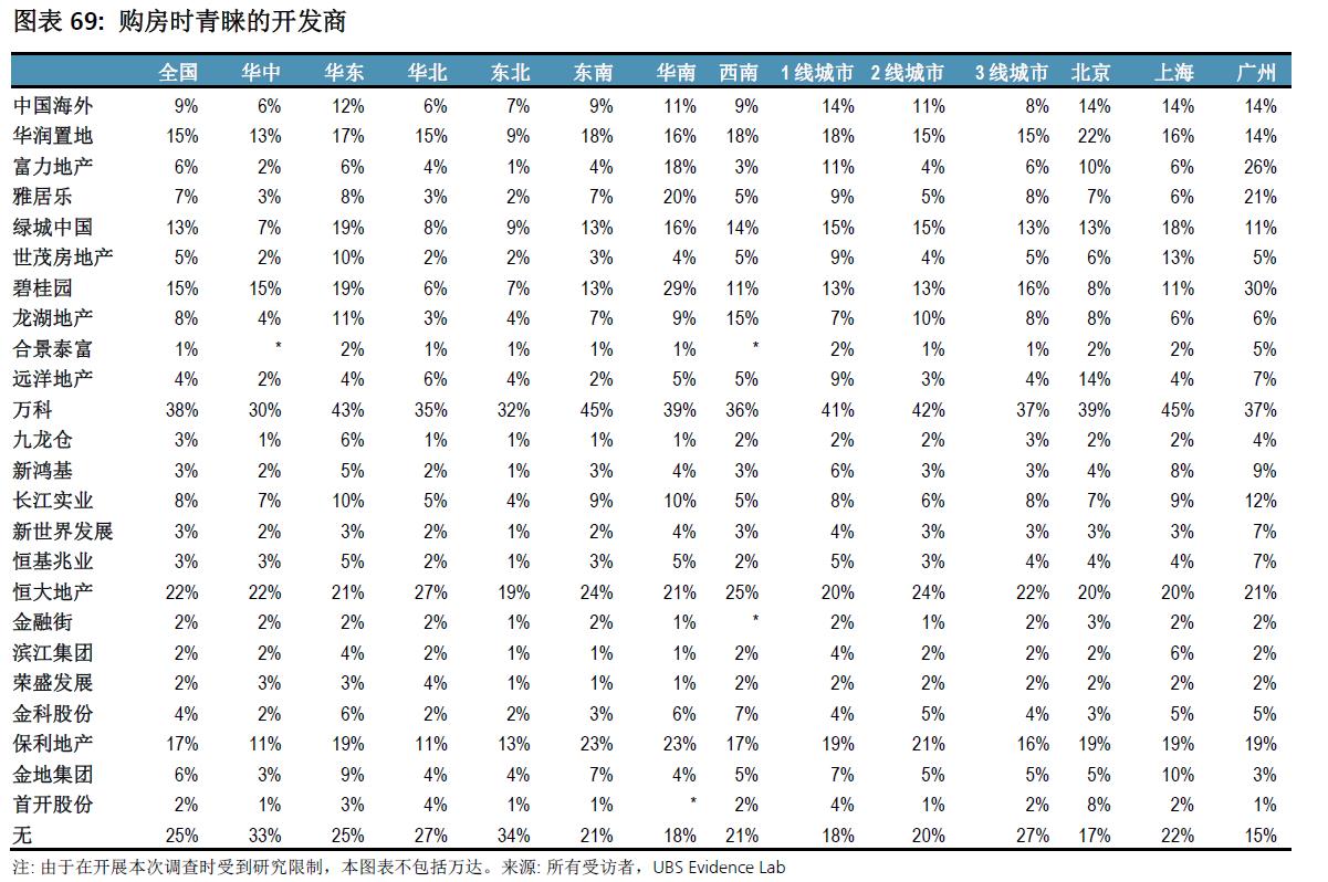 和楼盘本身相比,开发商的声誉对消费者的购房决定影响更大。在全国范围内,万科A和保利地产的品牌知名度最高,这可能是因为其业务 遍及全国。万科的开发质量获得了全国性认可,在各地区和各城市均颇受好评。保利地 产的认可度也较高。消费者购房时较青睐的往往是万科A和保利地产。