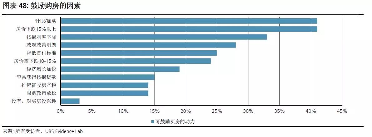 瑞银的调查结果显示,购买单套总价在50-200万元之间的自用型房屋的需求强劲,反映消费者对升级到更好社区或更大房屋的意愿。调查结果说明,只要有合适的房屋产品,通过降低抵押贷款利率且/或下调首付比例来放松政策在刺激需求、 缓解房地产市场低迷程度及其对经济的影响方面就应该是有效的。