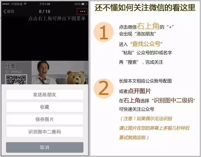 2. 长按本文相应公众账号配图,或者点开图片,在右上角选择“识别图中二级码”,可快速关注公众号。(注意!如果偶尔无法识别,请让图片在您的屏幕上多留几秒钟后,重试就搞定啦)