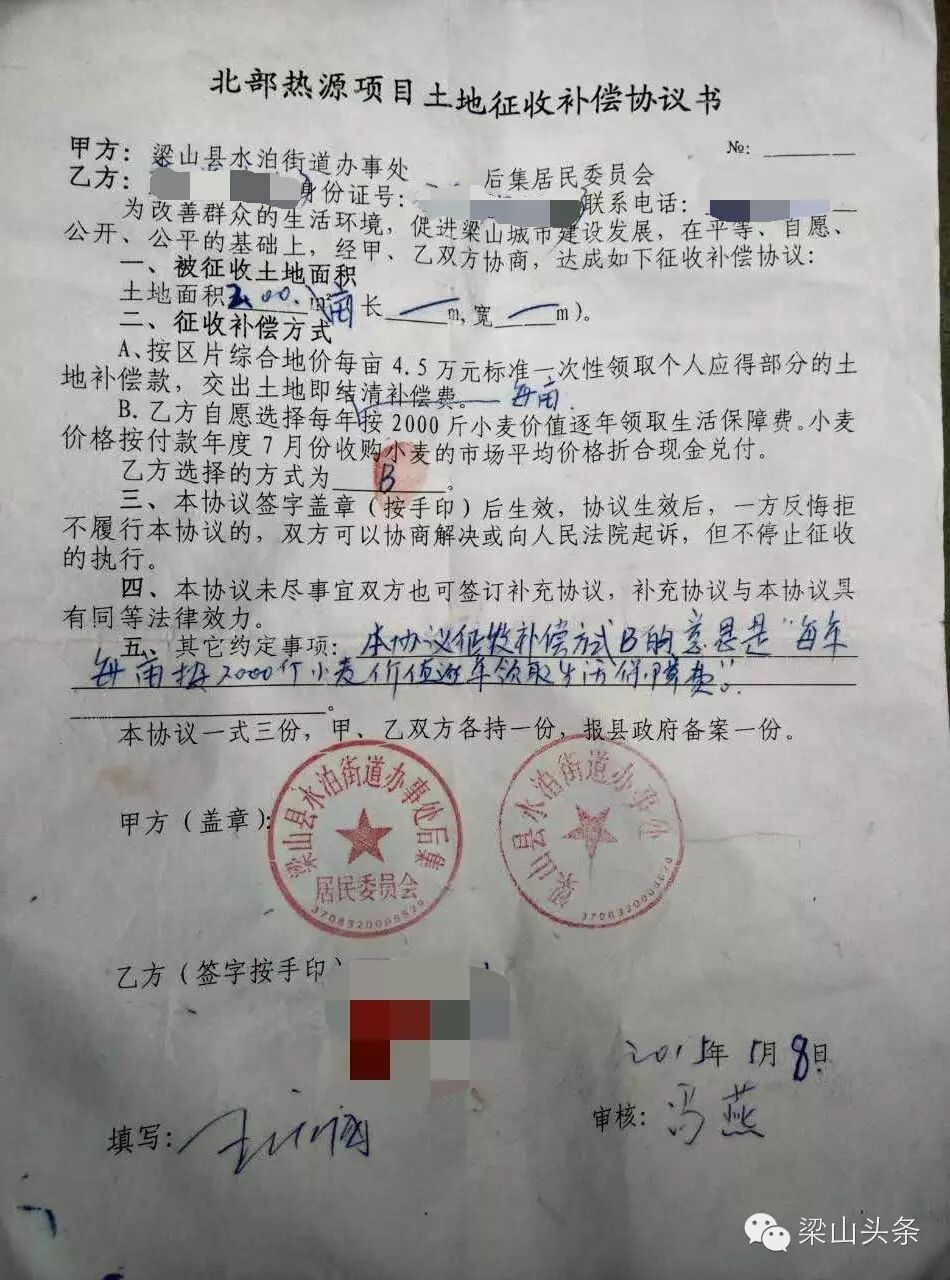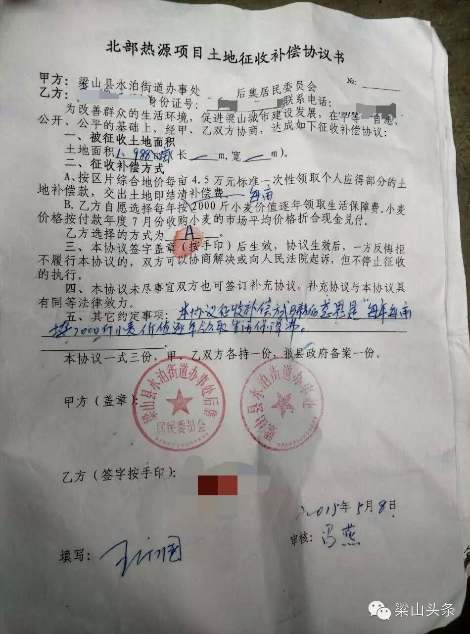 在后集村大队与后集村村民签署的“北部热源项目土地征收补偿协议书”中,补偿方式有两种:
