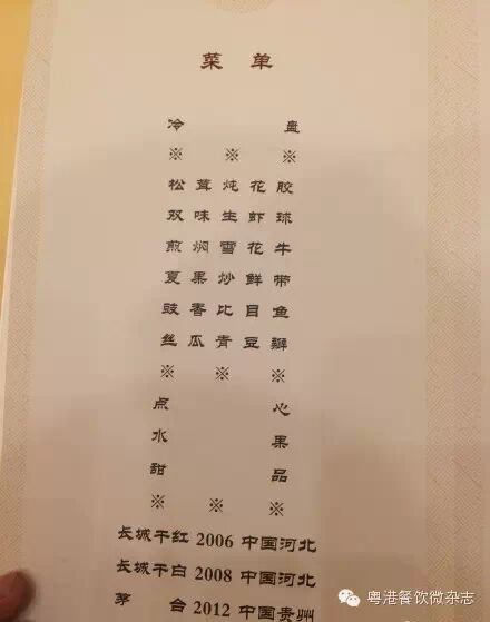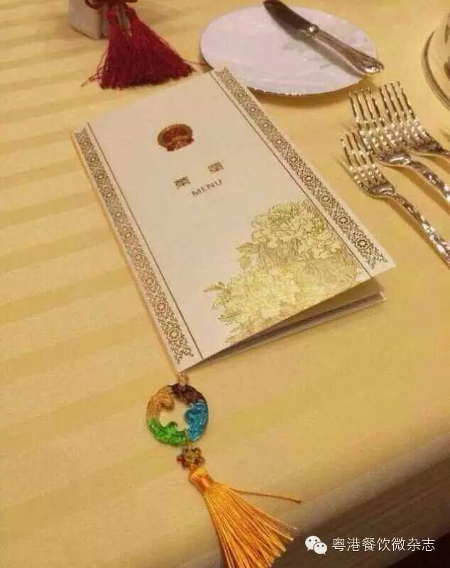 本次国宴除了冷盘、点心、水果、甜品之外,主菜是5菜1汤,分别是松茸炖花胶、双味生虾球、煎焖雪花牛、夏果炒鲜带、豉香比目鱼、丝瓜青豆瓣。