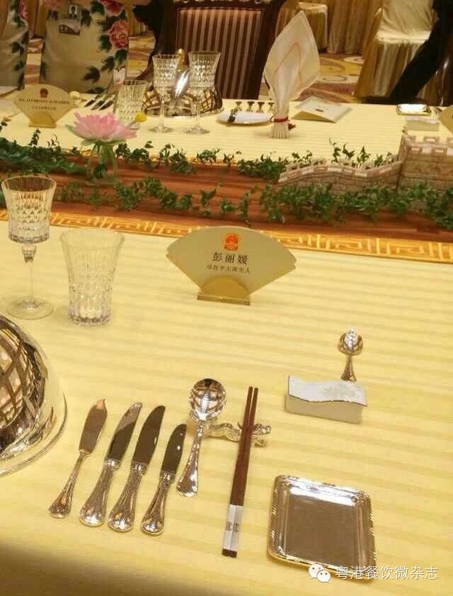 餐具方面,除中餐所需餐具外,还应摆上刀叉,左手边放叉,右手边放刀。公筷、公勺还应备有筷、勺座,其中一套应摆放在主人面前。APEC晚宴时,为嘉宾准备的餐具是银质刀叉和筷子。