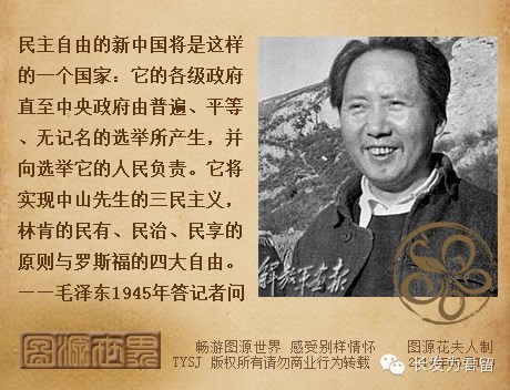 英国没有成文宪法,但是英国人民有平等 有自由,所以虽没有宪法也是民主国家。由此看来,民主政治的主要标志是人民有自由平等的权利……民主的潮流正在汹涌,现在是民权的时代,人民应有言论、出 版、集会、结社和身体的自由是真理,实现民主政治是真理,真理是要胜利的,所以高举民主的大旗奋斗着的世界和中国?